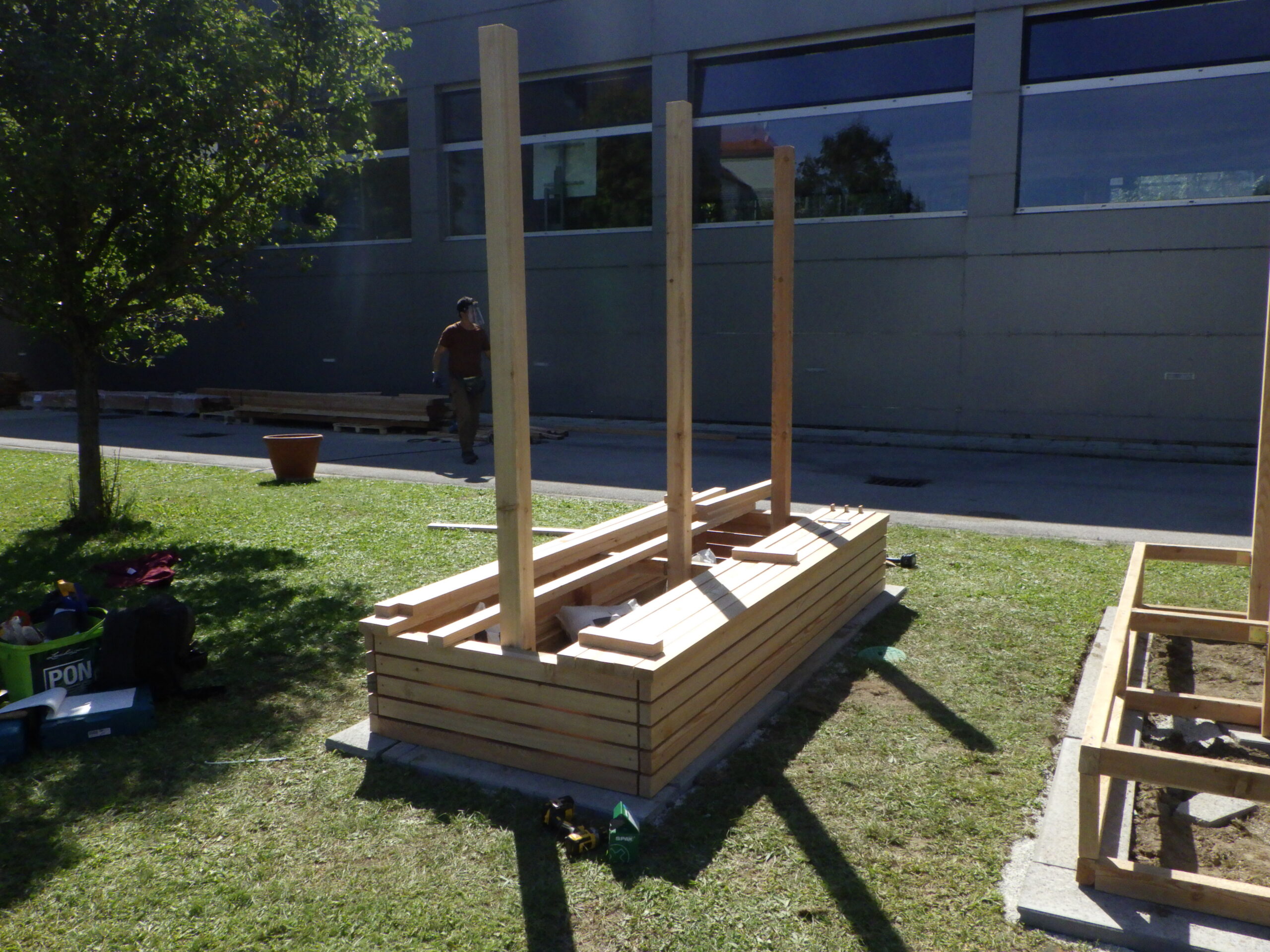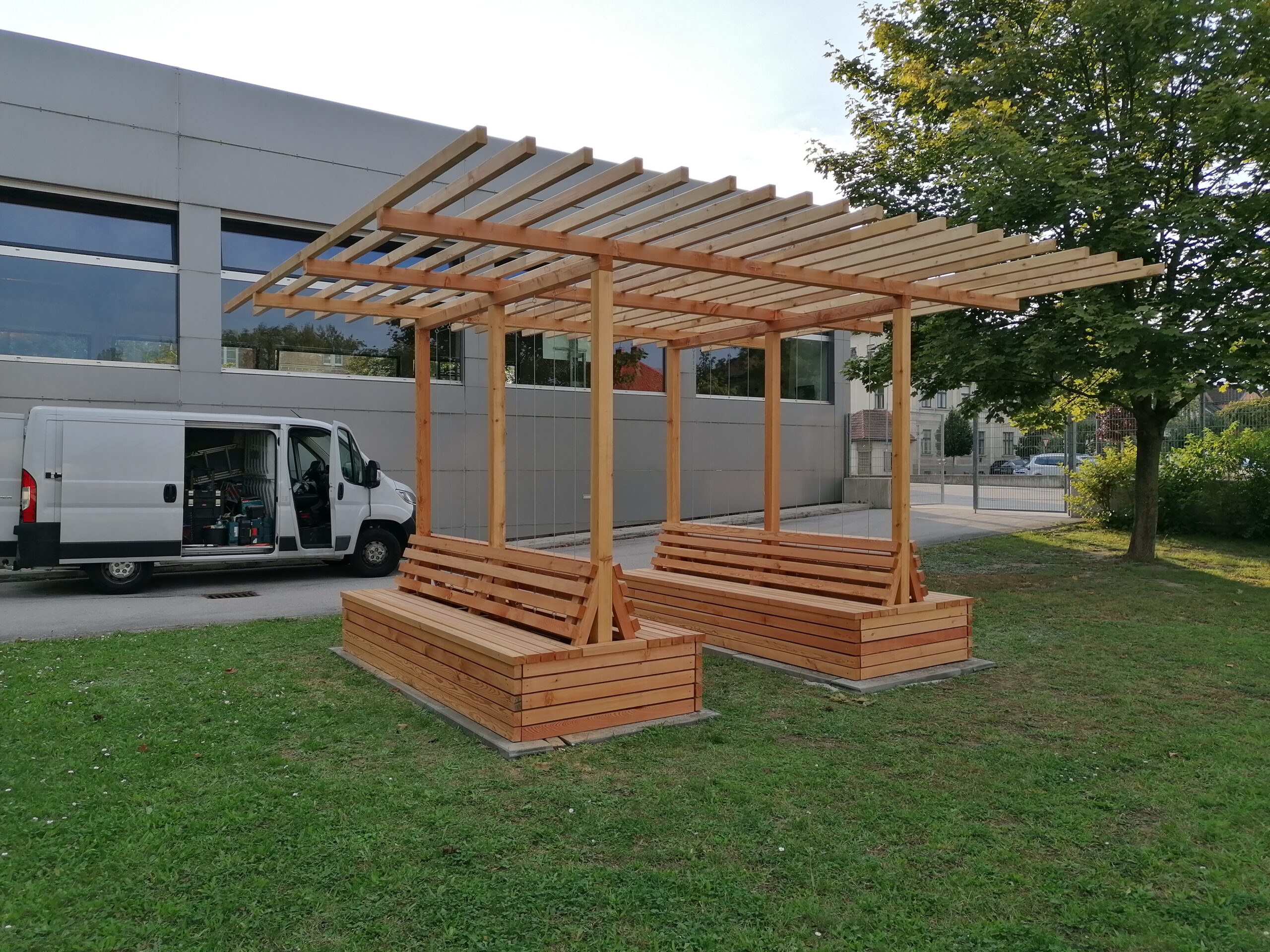 Wooden construction with bench & trellis